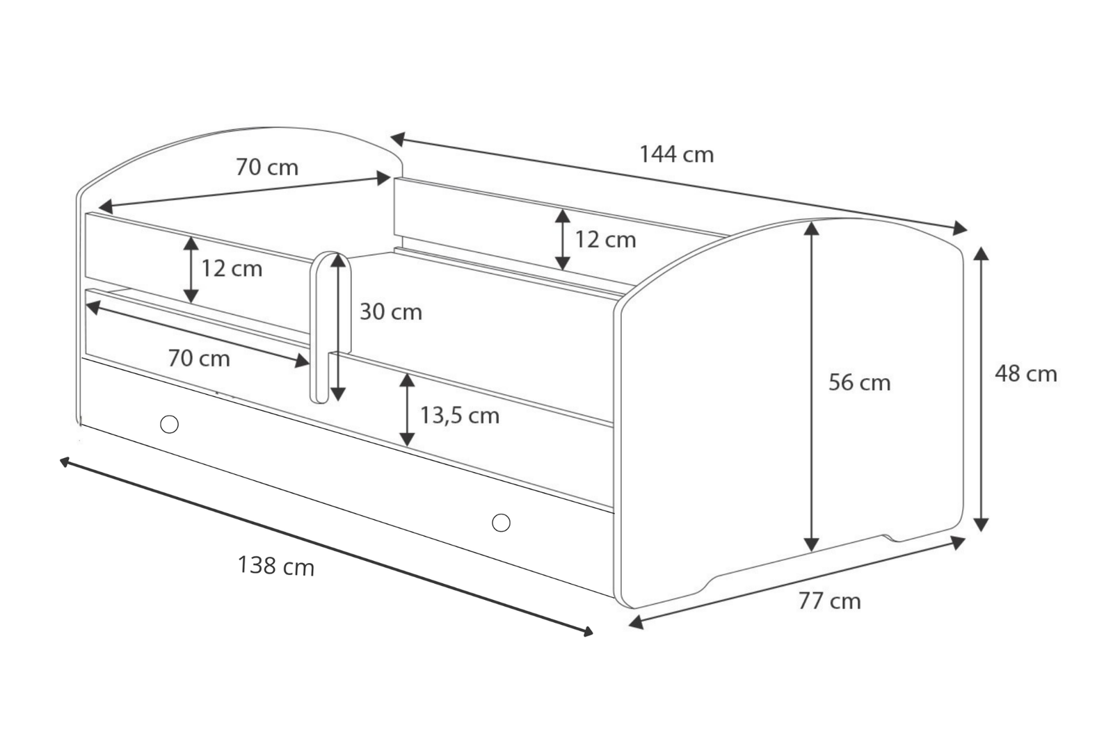 The LUK model combines solid construction, safety and comfort. The movable guard rail makes the bed suitable for both smaller children who need extra protection and older children who can use it as required. The comfortable mattress included is designed for a healthy and restful sleep for your child, while the spacious drawer provides practical storage for bedding, toys or clothes, helping to keep the room tidy. What’s more, the rounded edges and PVC protected borders minimise the risk of injury, ensuring the highest level of safety. The bed is made from certified, durable materials, guaranteeing not only its longevity, but also its friendliness to the environment and your child’s health. Thanks to the unique print, the furniture becomes the focal point of the room, combining practical functions with decorative qualities.