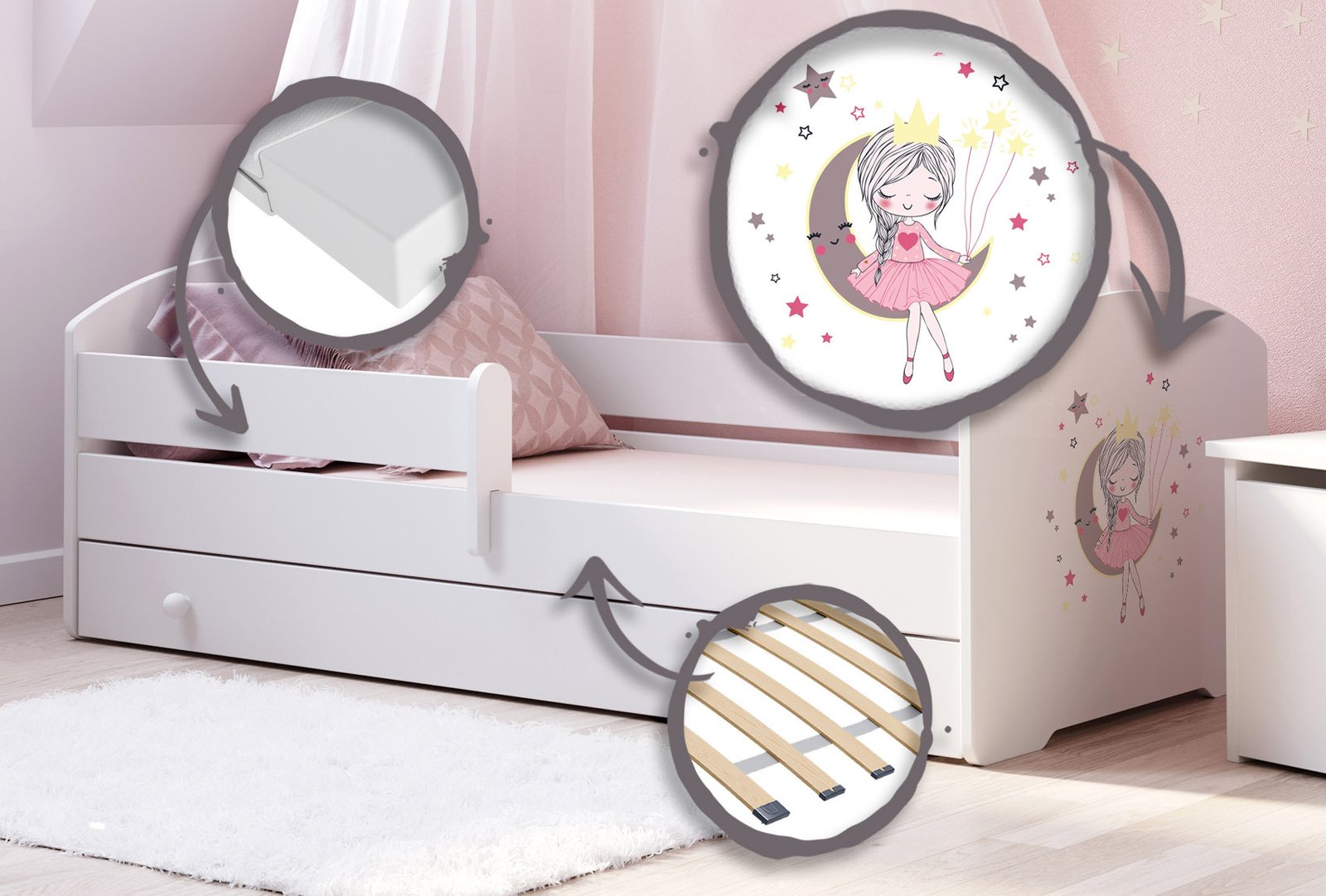 The Kobi LUK children’s bed in size 140×70 cm is the ideal solution for parents looking for a functional and aesthetically pleasing piece of furniture that will also delight its youngest users. Decorated with a colourful children’s print on the front, the bed brings a joyful and unique accent to the child’s room, while maintaining a universal white colour that is easy to match with any arrangement.