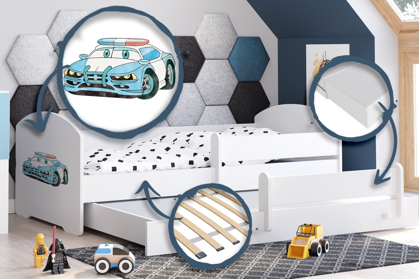 The LUK II model is a white Kobi Children’s Bed enriched with a cheerful children’s print on the front, which perfectly combines practicality with aesthetic appeal. The built-in drawer with the function of an additional sleeping area is the ideal solution for guests’ visits or siblings’ nights in together. Thanks to the universal white colour scheme and the colourful print, the bed fits perfectly into the décor of both girls’ and boys’ rooms, giving it a unique character.