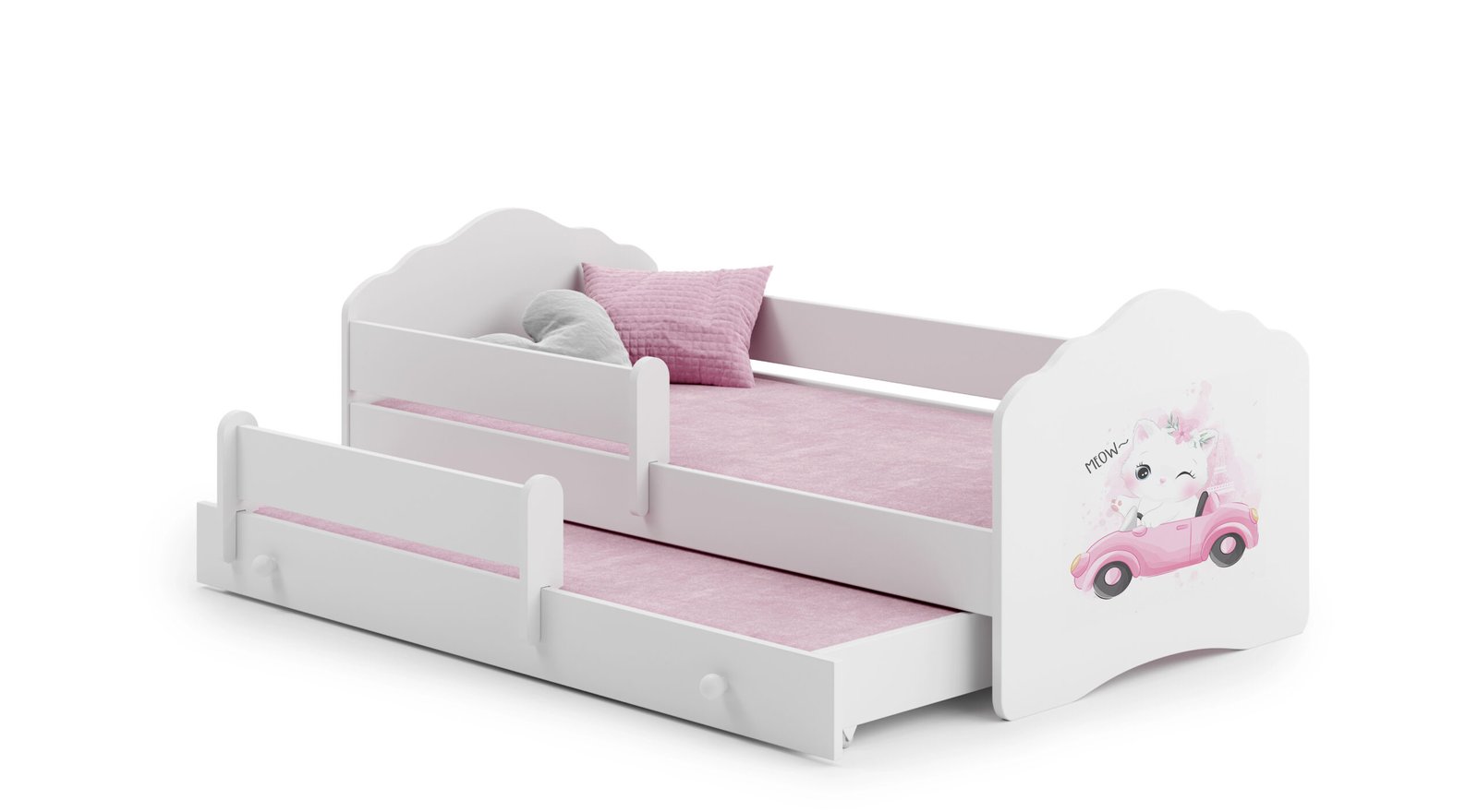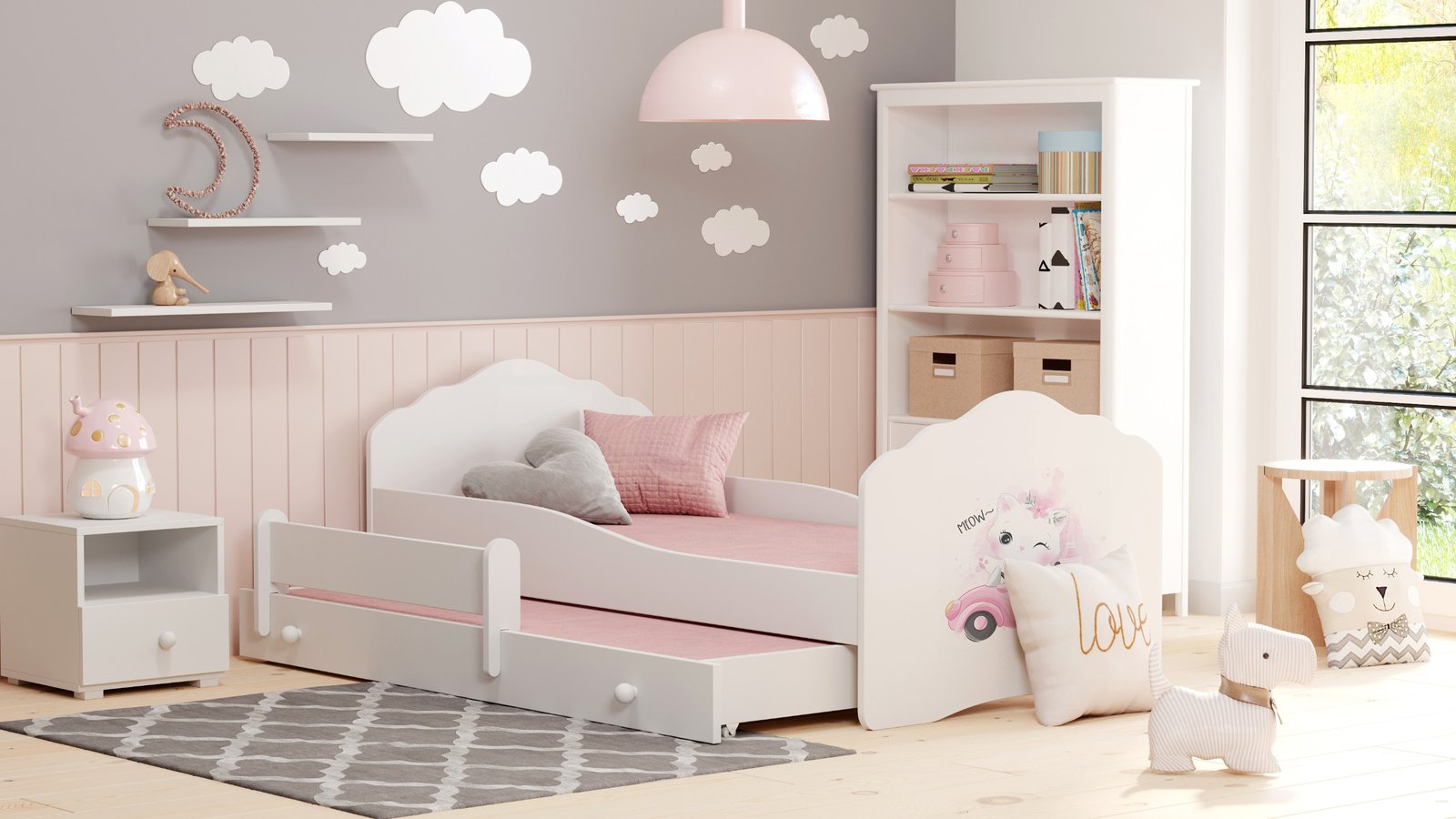 The FALA II bed ensures maximum safety thanks to its rounded edges and removable safety rails, which prevent your child from falling out while sleeping. Made from certified materials, it is characterised by its durability and eco-friendly production. The white bed with children’s graphics brings a joyful and fairytale atmosphere to the room, which will make the time for play and rest more pleasant. The print is not only pleasing to the eye, but also enriches the space, making the bed a unique decorative element. The sturdy furniture board construction and FLEX frame ensure a comfortable night’s sleep, and two mattresses and frames are included for everyday comfort. The bed is easy to assemble with the included instructions, and its durability means it will last for years to come.