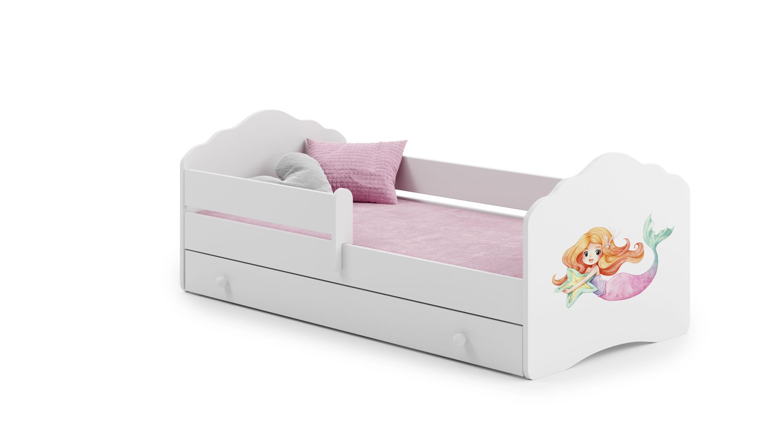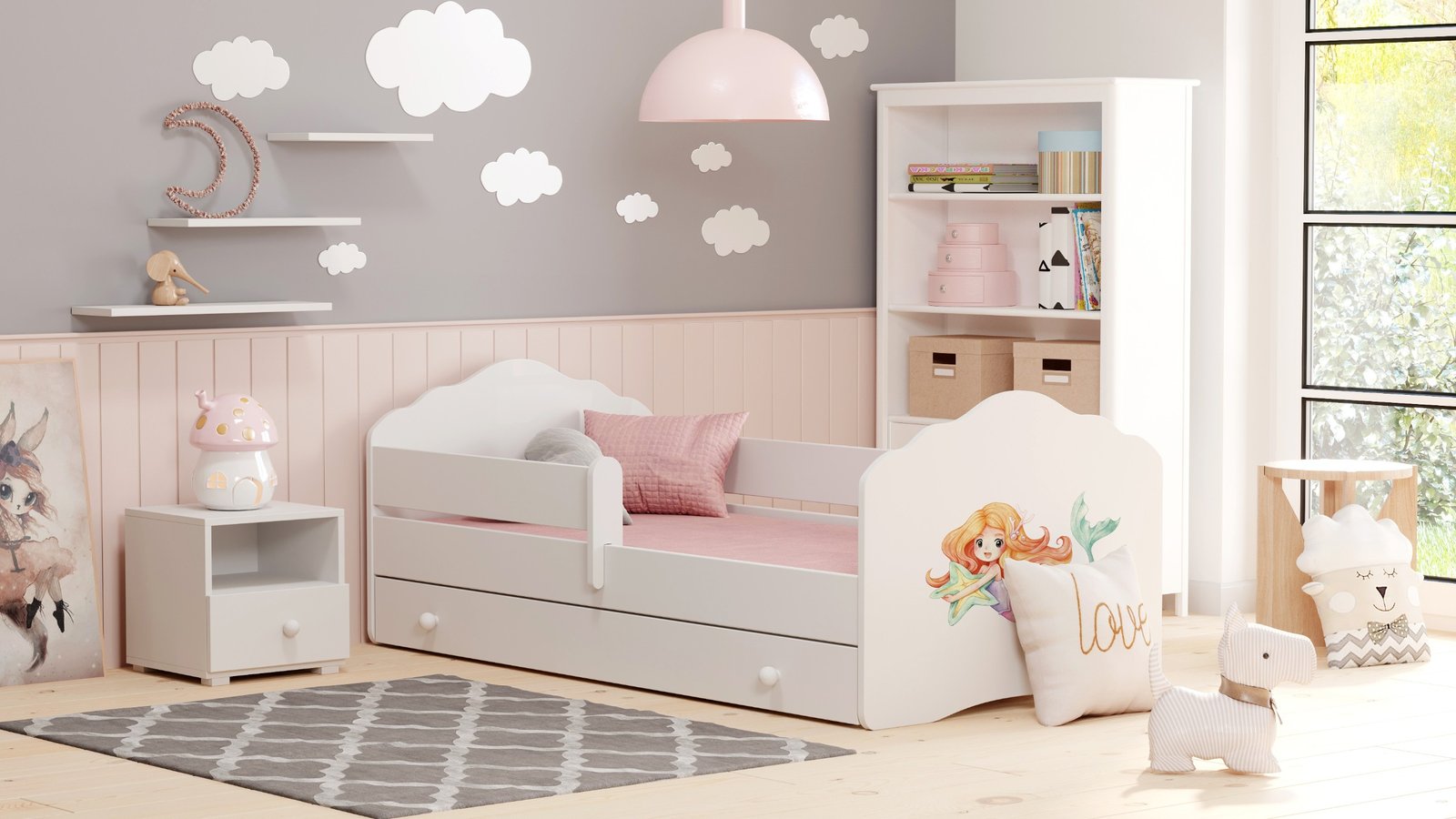 The FALA bed has been designed with the safety of little ones in mind. Rounded edges and PVC protected borders effectively protect against injuries, and a movable railing prevents the child from falling out during sleep. The structure made of high quality furniture board ensures stability and durability, withstanding a load of up to 110 kg. Thanks to the FLEX frame with sprung slats, the bed offers optimum support for healthy sleep. The practical drawer allows you to store bedding or toys, helping to keep the room clean. A charming children’s graphic on the front makes the bed not only functional, but also a decorative interior feature