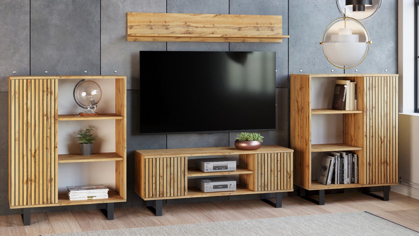 The FOCUS model was designed with maximum functionality and aesthetics in mind. Thanks to its well-thought-out design, it offers shelves and lockable cabinets to accommodate books, newspapers, remote controls, as well as multimedia equipment such as set-top boxes and games consoles. The lath-like décor on the fronts emphasises the modern style of the cabinet, bringing a unique touch to the interior. Its neutral colours and design allow it to fit into a variety of arrangements – from minimalist to more classic.