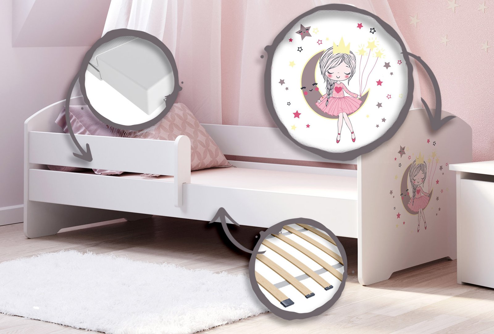 The Kobi LUK children’s bed with railing and colourful print is the perfect solution for any children’s room. Thanks to the attractive childish graphics on the front, the furniture becomes not only a functional piece of furniture, but also a decoration of the interior. The universal size of 160×80 cm makes the bed perfectly suitable for smaller spaces, while ensuring comfort and safety for the child.