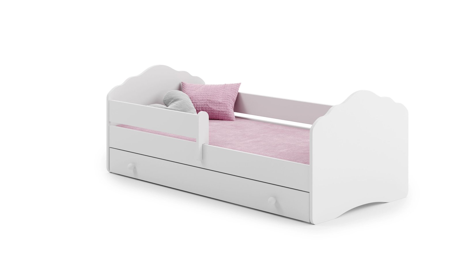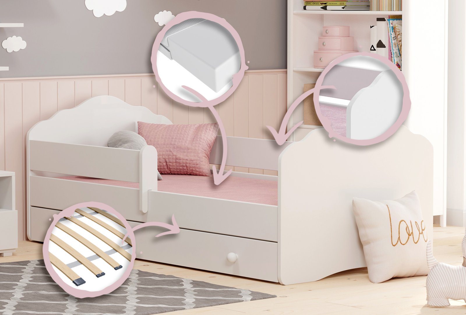The FALA bed has been designed with your child’s safety and comfort in mind, making it the perfect choice for a toddler’s room. The rounded edges, which are further protected by PVC edging, minimise the risk of injury, ensuring maximum protection during sleep and play. The sturdy construction made of high quality furniture board guarantees the stability and durability of the furniture for years to come, while the FLEX frame with flexible sprung slats provides support for your child’s healthy posture by adapting to their natural body curves. It also comes with a mattress, designed specifically for the dimensions of the bed, ensuring a comfortable and convenient sleep. A large drawer located under the bed is a great solution for storing bedding, toys, books or other children’s accessories, allowing the room to remain tidy. Thanks to this, the FALA bed combines functionality, aesthetics and attention to detail, making it not only practical but also a beautiful piece of furniture for a girl’s room