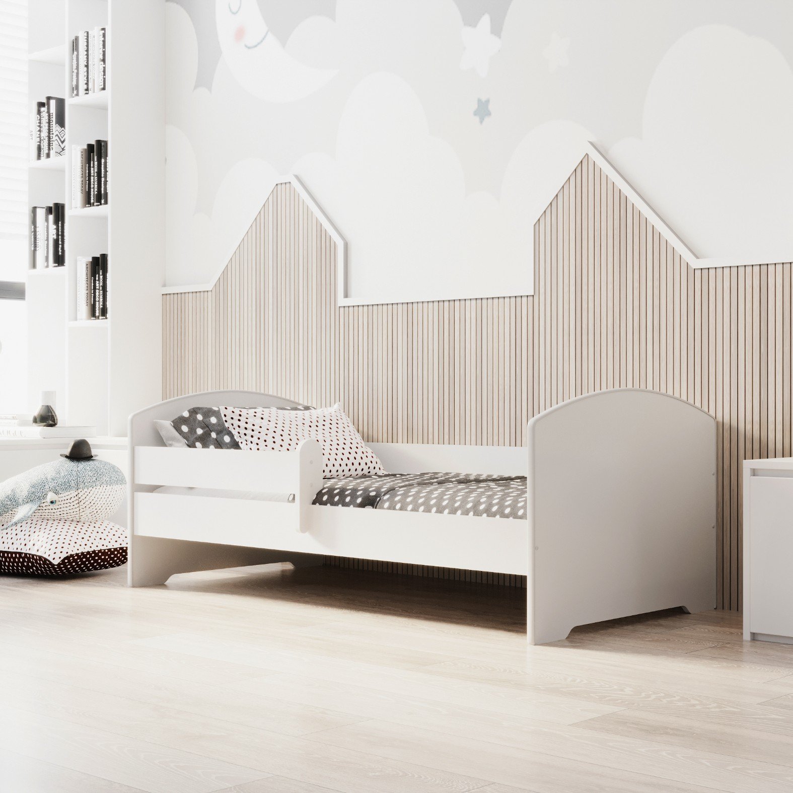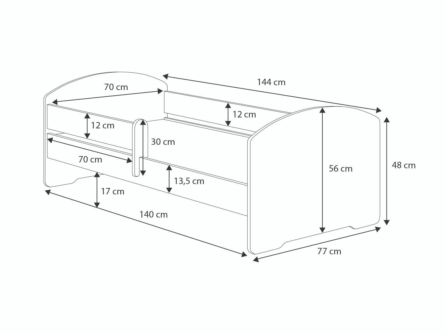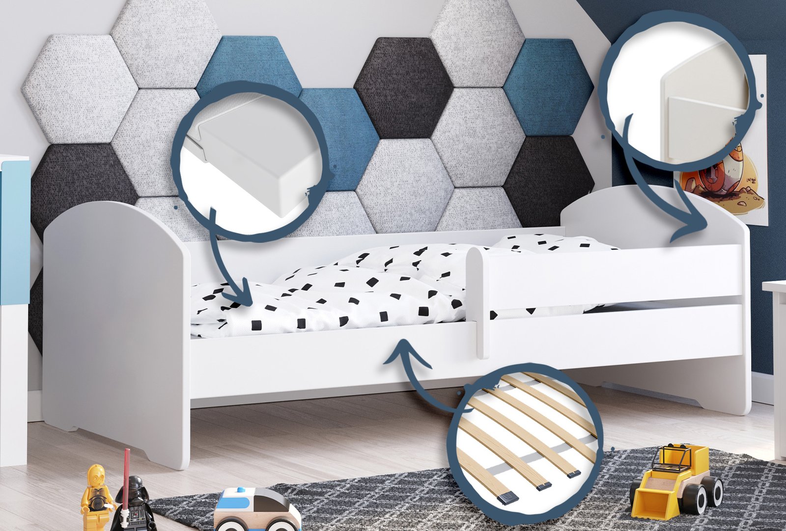 Ensuring maximum safety and comfort, the LUK model has been designed with the youngest users in mind. The bed is available in a 140×70 cm size and is equipped with a movable safety rail to minimise the risk of falls. The high-quality furniture board construction guarantees durability, while the use of rounded edges and PVC edging further enhances safety. The product is designed for self-assembly and has been made from certified raw materials.
