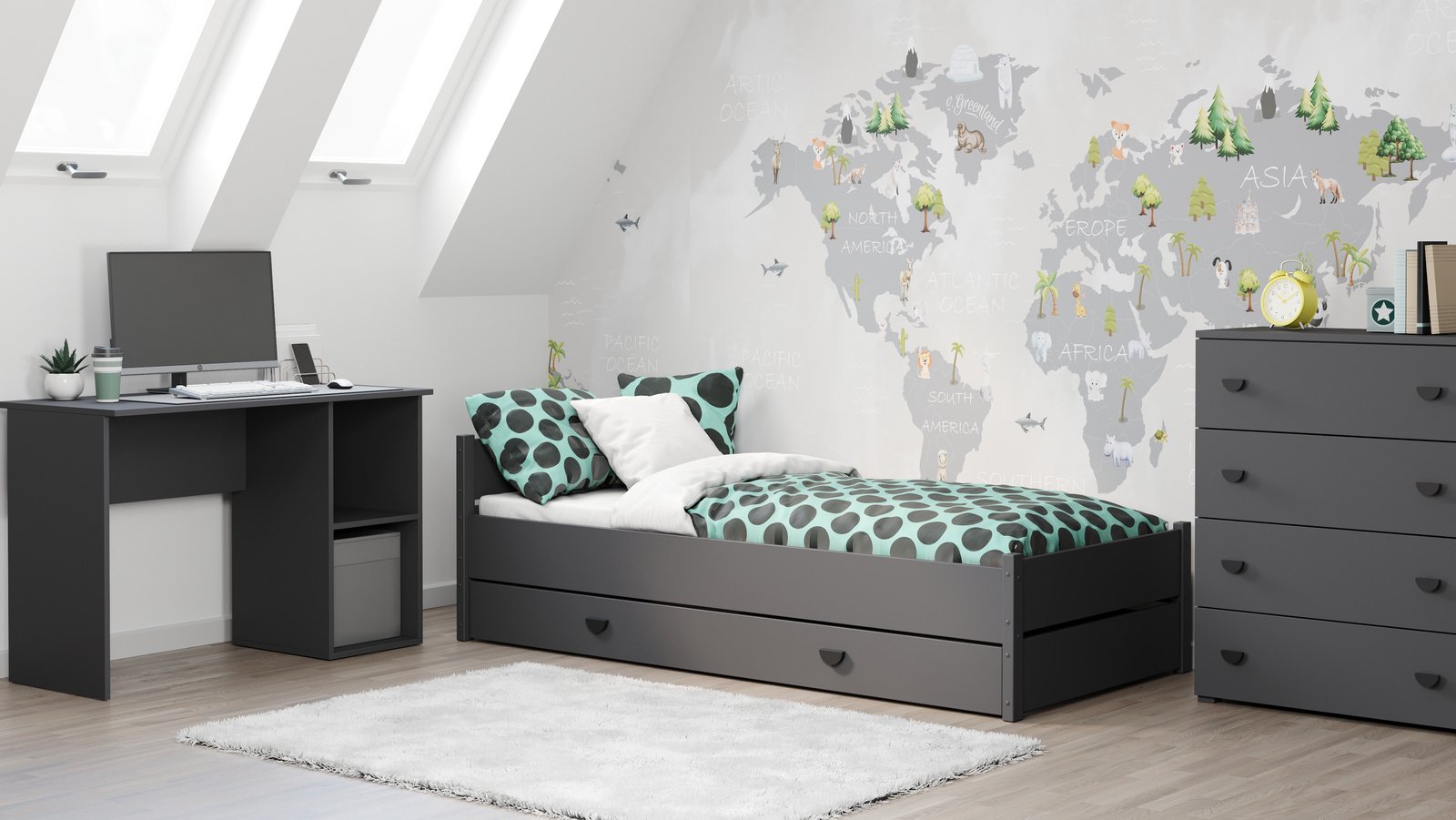 The TAKO desk offers a wide top, providing a comfortable space for work, study or creative activities. An additional side shelf adds to the practicality, allowing for convenient storage of the most necessary items. Made of laminated furniture board, the desk is characterised by its resistance to daily use and ease of cleaning. The versatility of the product is emphasised by the choice of colour, which allows it to perfectly match the character of the interior.